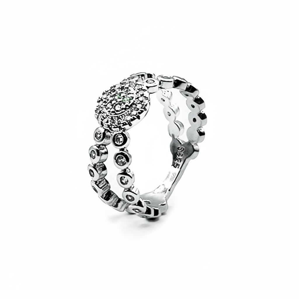 Adorne o seu dedo com a elegância em detalhes deste anel deslumbrante. Deixe que o círculo central cravejado e os detalhes em bolinhas de zircônias iluminem a sua jornada com um toque de luxo que cativa o olhar e o coração.