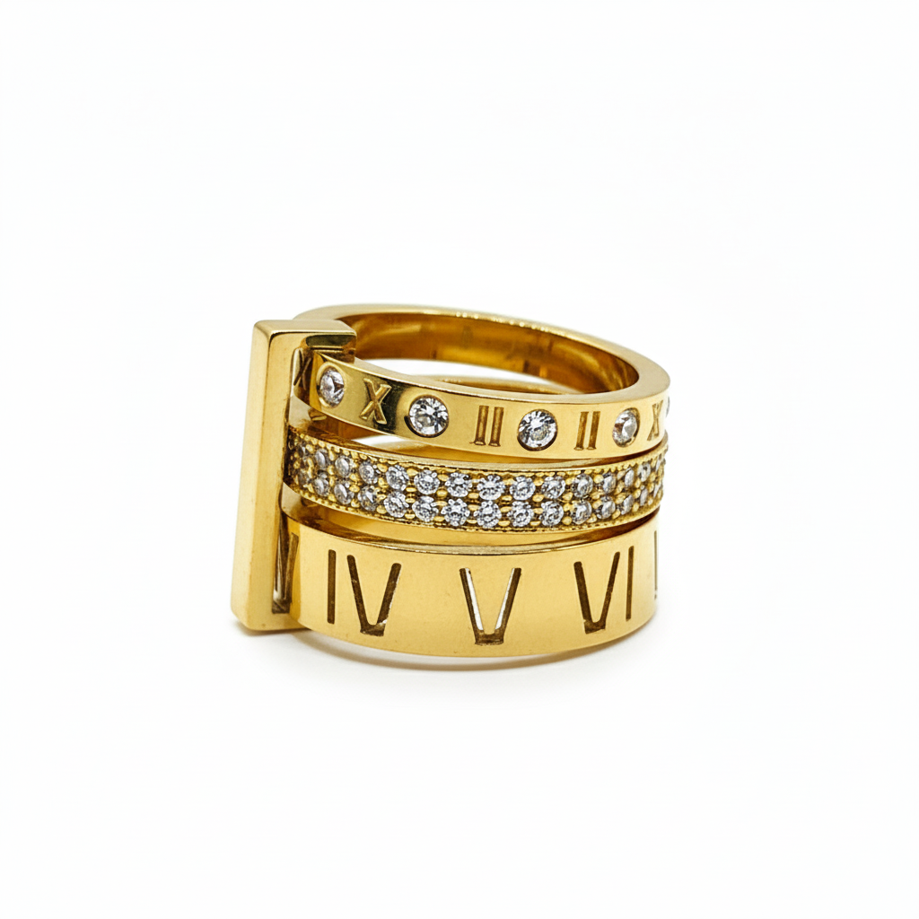 Adicionando um elemento de mistério e fascínio, o anel apresenta gravações vazadas em números romanos ao longo da superfície. Essa atenção meticulosa aos detalhes evoca uma sensação de sofisticação clássica e confere um toque pessoal e único à sua joia. Além de sua estética impressionante, o design do Anel Triplo é ergonomicamente pensado para oferecer o máximo conforto. Ele se adapta perfeitamente ao seu dedo, permitindo que você o use com confiança durante todo o dia e a noite.