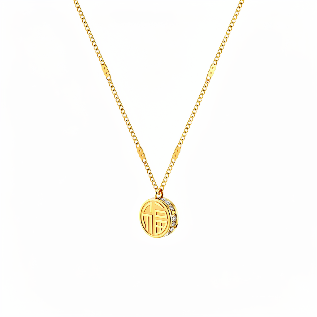 O pingente circular central é o ponto alto deste colar magnífico. Cercado por uma fileira de zircônias cintilantes, cada uma cuidadosamente fixada à mão, ele incorpora um glamour sutil e uma sofisticação refinada. As zircônias deslumbrantes refletem a luz de maneira hipnotizante, adicionando um toque de luxo que chama a atenção de todos os ângulos.