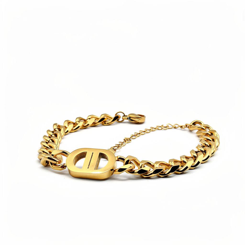 O destaque desta pulseira é a seção frontal, que apresenta um design distinto em forma de dois elos em formato de D inspirado em uma grande grife, entrelaçados com precisão para criar um efeito visual marcante e harmonioso. Este detalhe único adiciona um toque de exclusividade e classe, capturando a essência de uma alta moda contemporânea. A estrutura de correntes proporciona um brilho sutil e uma fluidez impressionante, enquanto o acabamento meticulosamente polido garante uma peça de destaque em qualquer ocasião. Seja para complementar um look diário ou para ocasiões especiais, esta pulseira é a escolha perfeita para quem busca um toque de elegância com um design inovador.